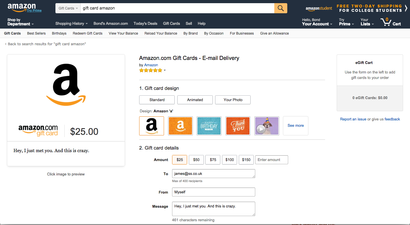 - Purchase an Amazon Gift Card. Send the e-mail to yourself.